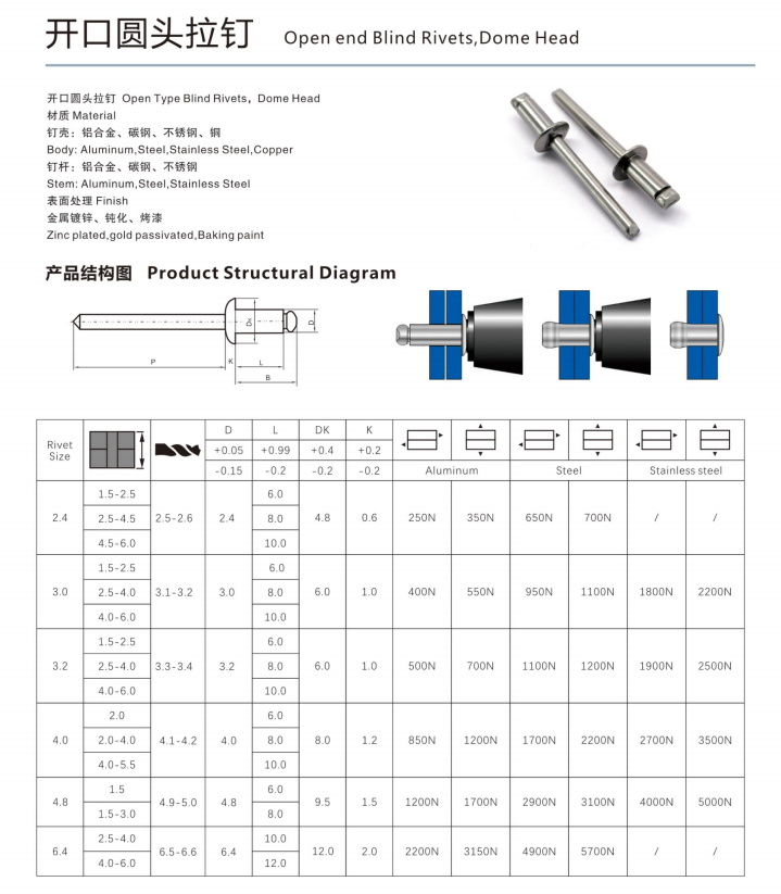 圆头抽芯铆钉,圆头拉钉,铜拉钉,铜抽芯铆钉,开口拉钉,开口抽芯铆钉